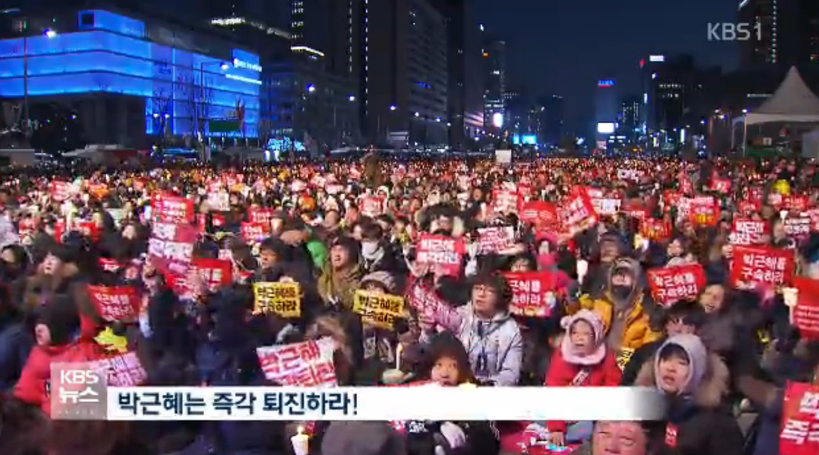 After the decision to impeach President Bak was taken by the National Assembly yesterday, citizens held a candlelight rally urging Bak to resign at once before the Constitutional Court makes the final decision on the impeachment. “Bak Geunhye – resign!” is the slogan. Just outside the Blue House protesters set off firecracker to celebrate the news of the impeachment, and various scenes of celebration and festivities could be seen. Some protesters marched within a hundred metres of the Blue House. This is the second-closest approach made to the Blue House, with only the 6th rally (in November) having come closer. Immediately after hearing the news of the impeachment protesters marched around the east, west and south of the Blue House and shouted for Bak’s resignation.