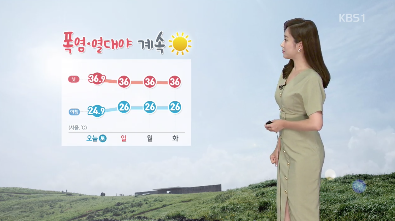 Today the weather is even warmer than yesterday. Typhoon Ampil is pushing hot air towards the Korean peninsula, so making the heat wave even more severe. Temperatures in Seoul today hit 36.9°c, with the heatwave and tropical storms expected to continue. As things stand, night-time temperatures in Seoul are expected to hit around 25°c with highs of 36°c during the day. There are almost no clouds in the sky to cover the sun. Yesterday the entire country experienced sunshine, with the exception of Jeju which had some light rainfall from early morning. The air pollution index was rated as “normal.” The dawn temperature of 26°c in Seoul, Busan and Gwangju was slightly higher than yesterday. In comparison the midday temperature in Seoul was 36°c, compared with 35°c in Gwangju and 37°c in Daegu. Due to the indirect influence of typhoon Ampil Jeju’s north coast may experience violent waves up to 8m high. Next week it will be clear and hot without rain.